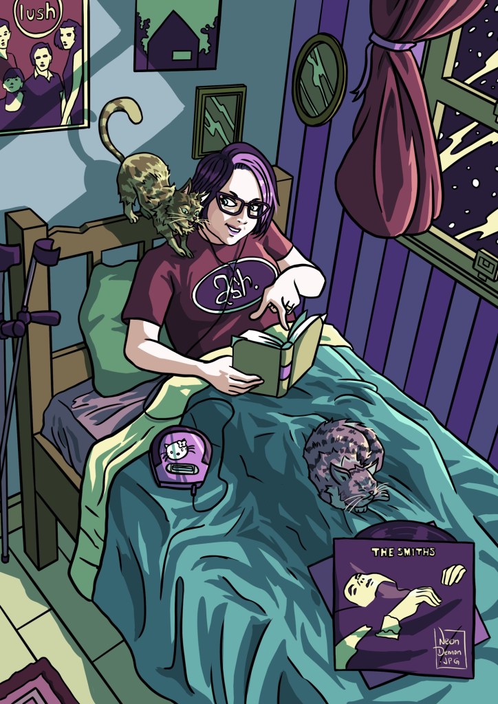 My talented friend Luciano Oliveira, (AKA neondemon.jpg) has created this lovely portrait of my two cats and me! Includes nods to Hello Kitty, Lush, The National, Ash, The Smiths, and even my mobility aids! I love it.
